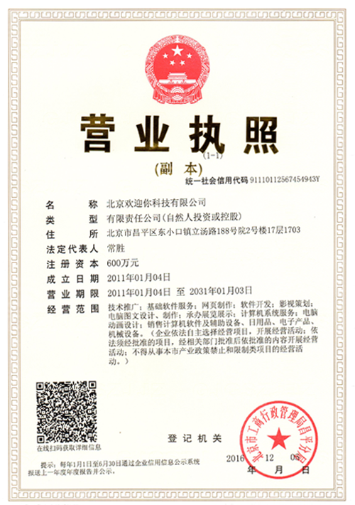 北京歡迎你科技有限公司獲得多項(xiàng)版權(quán)局"計(jì)算機(jī)軟件著作權(quán)登記證書(shū)",并已獲得“全國(guó)誠(chéng)信經(jīng)營(yíng)示范單位”、“全國(guó)質(zhì)量服務(wù)客戶(hù)滿(mǎn)意誠(chéng)信企業(yè)”和“全國(guó)重合同守信用品牌企業(yè)”等榮譽(yù)稱(chēng)號(hào)。